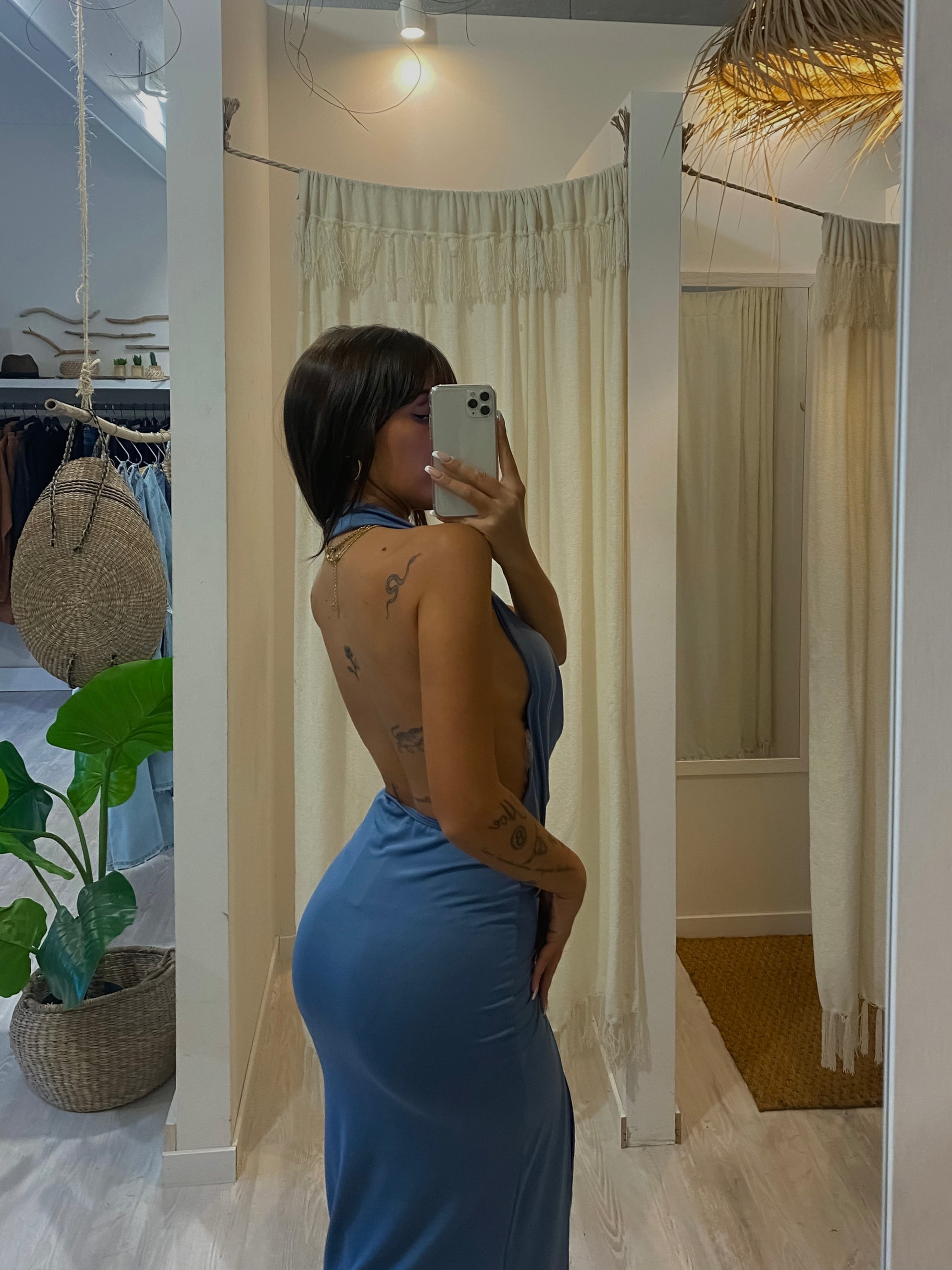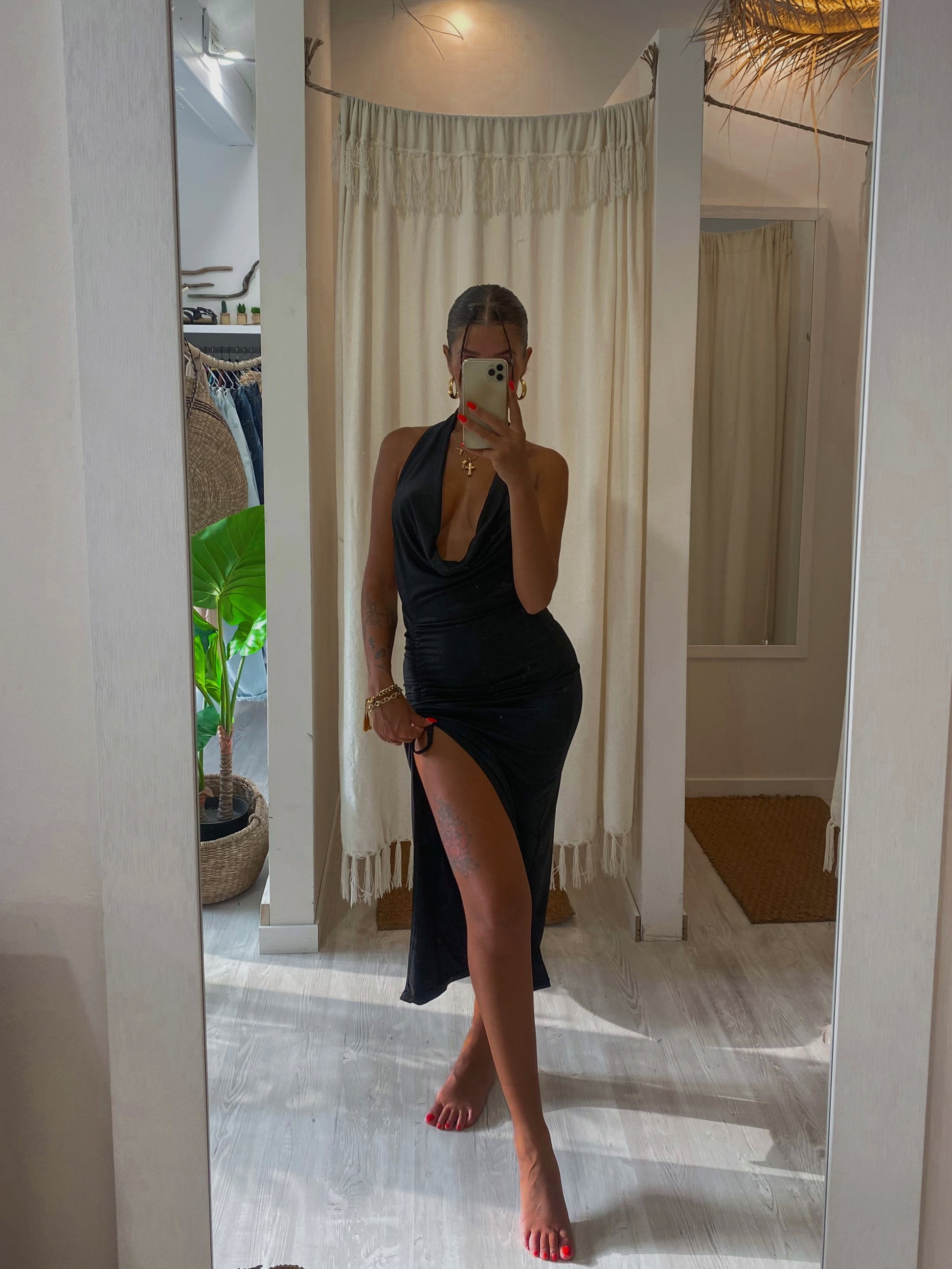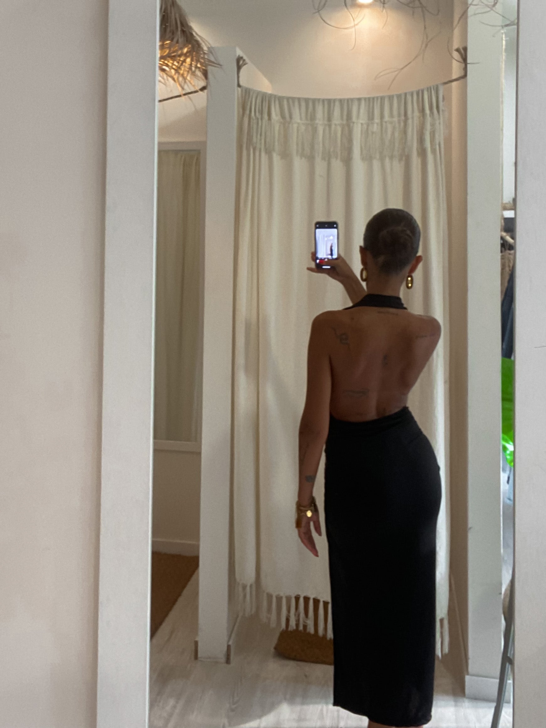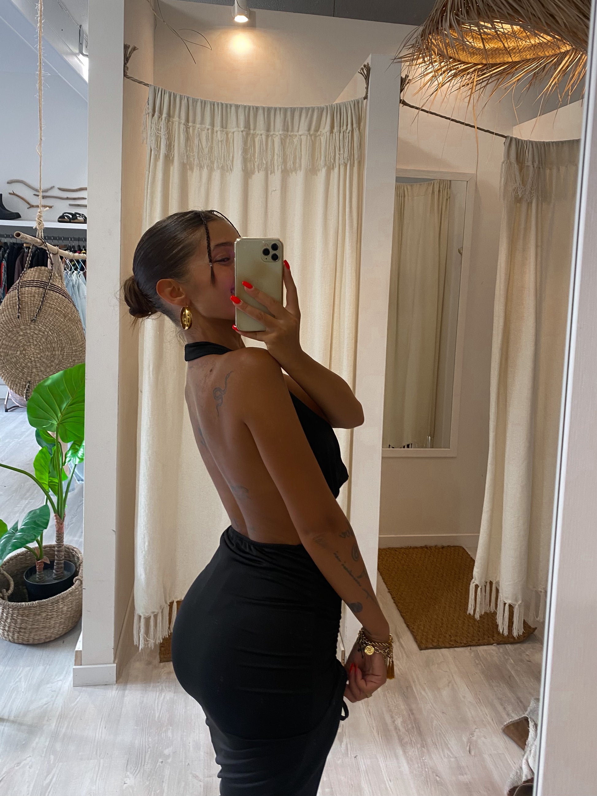 Abito lungo aderente. Scollatura davanti e schiena aperta. Tessuto leggero in micro olio. Elasticizzato. Taglia unica🌴