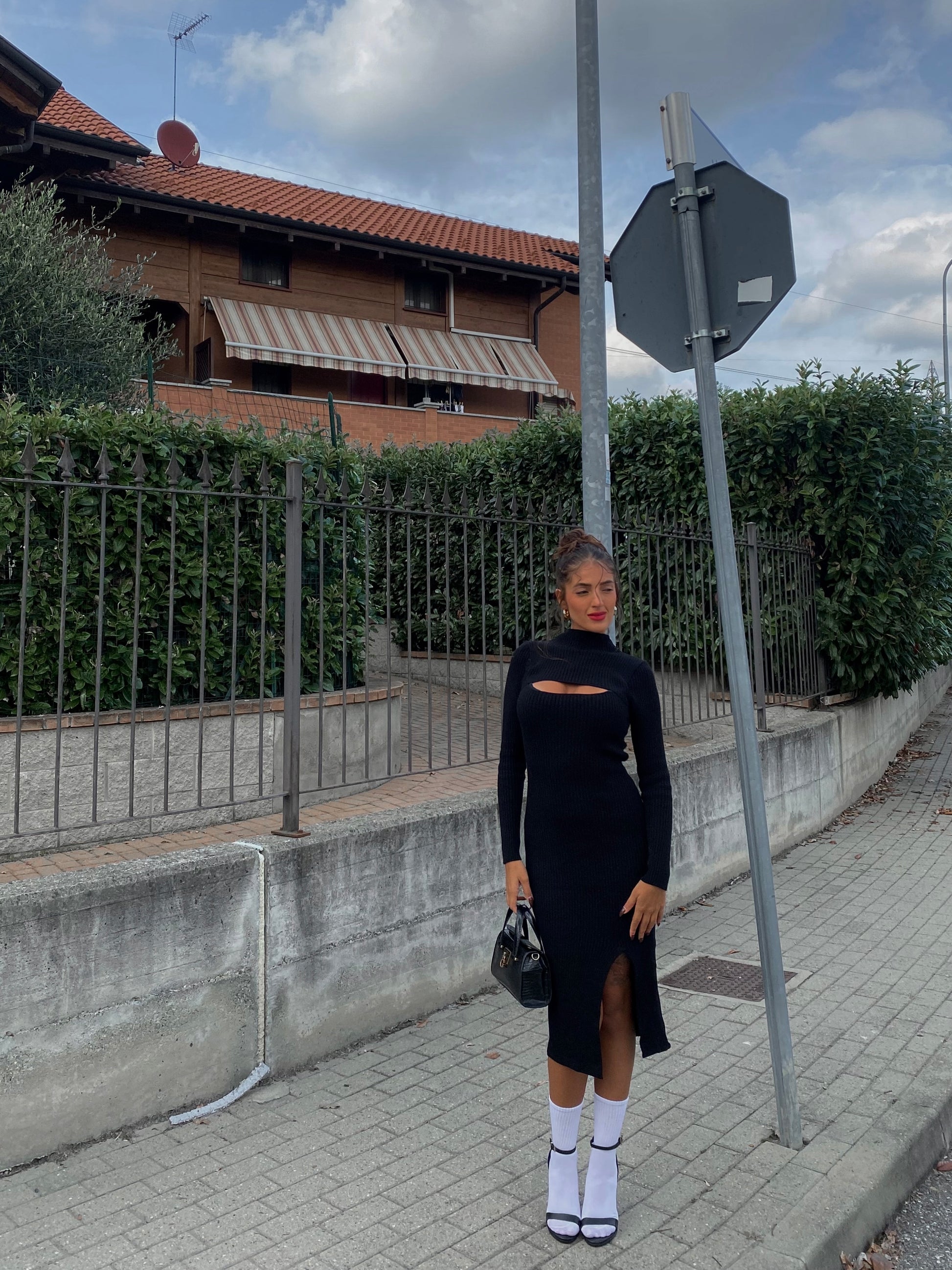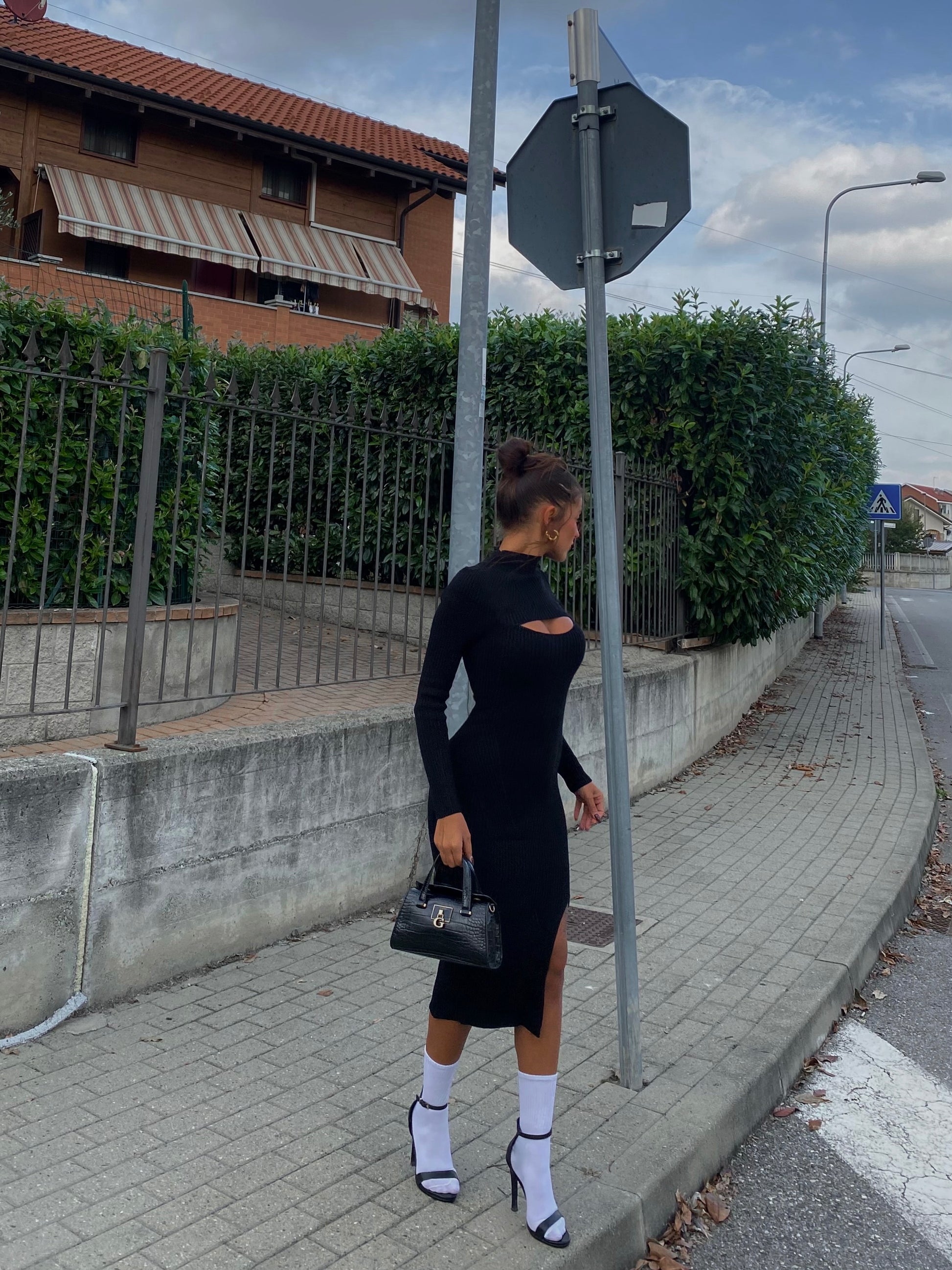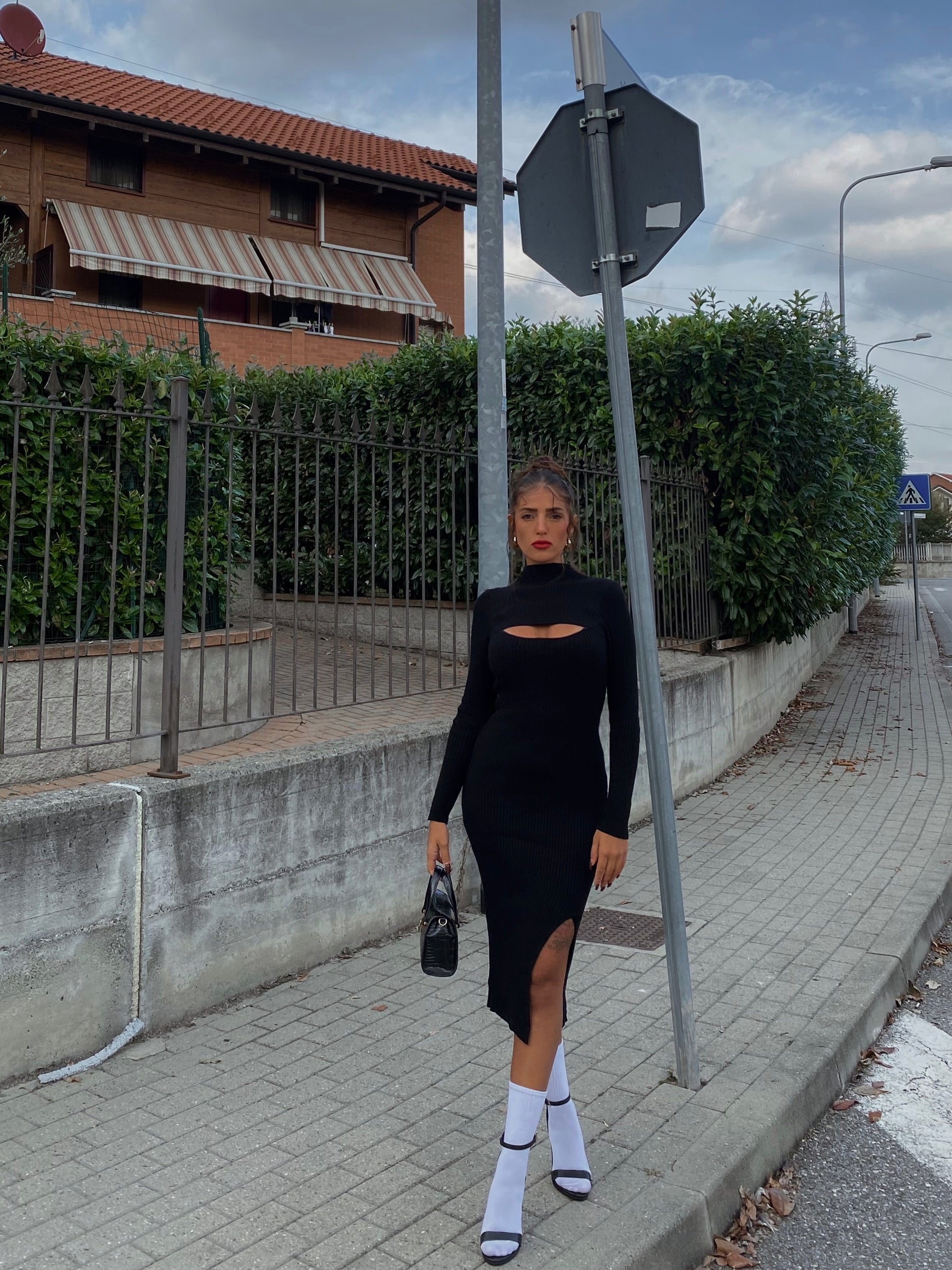 Abito longuette a costine, aderente, manica lunga, tessuto elasticizzato, scollato sul petto.