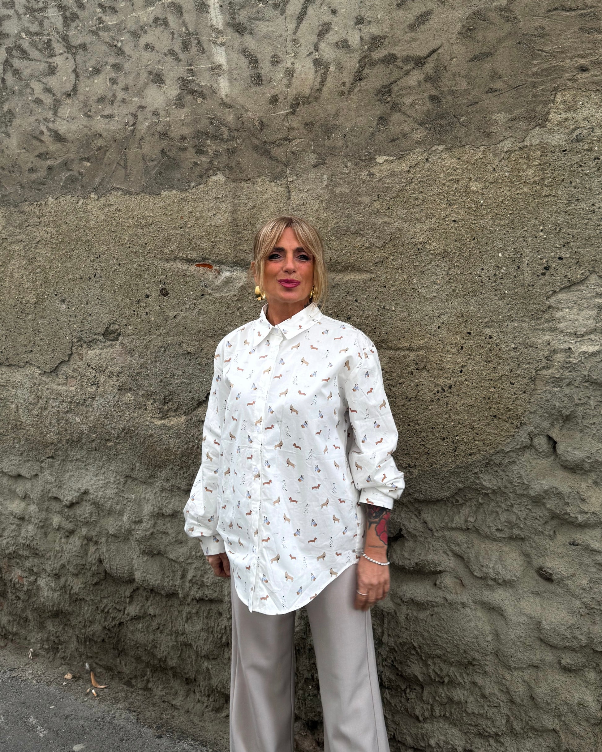 Camicia in 100% cotone dalla mano fresca e leggera, perfetta per la stagione primaverile. La base bianca è arricchita da una delicata stampa di cagnolini, che dona un tocco ironico e raffinato allo stesso tempo.