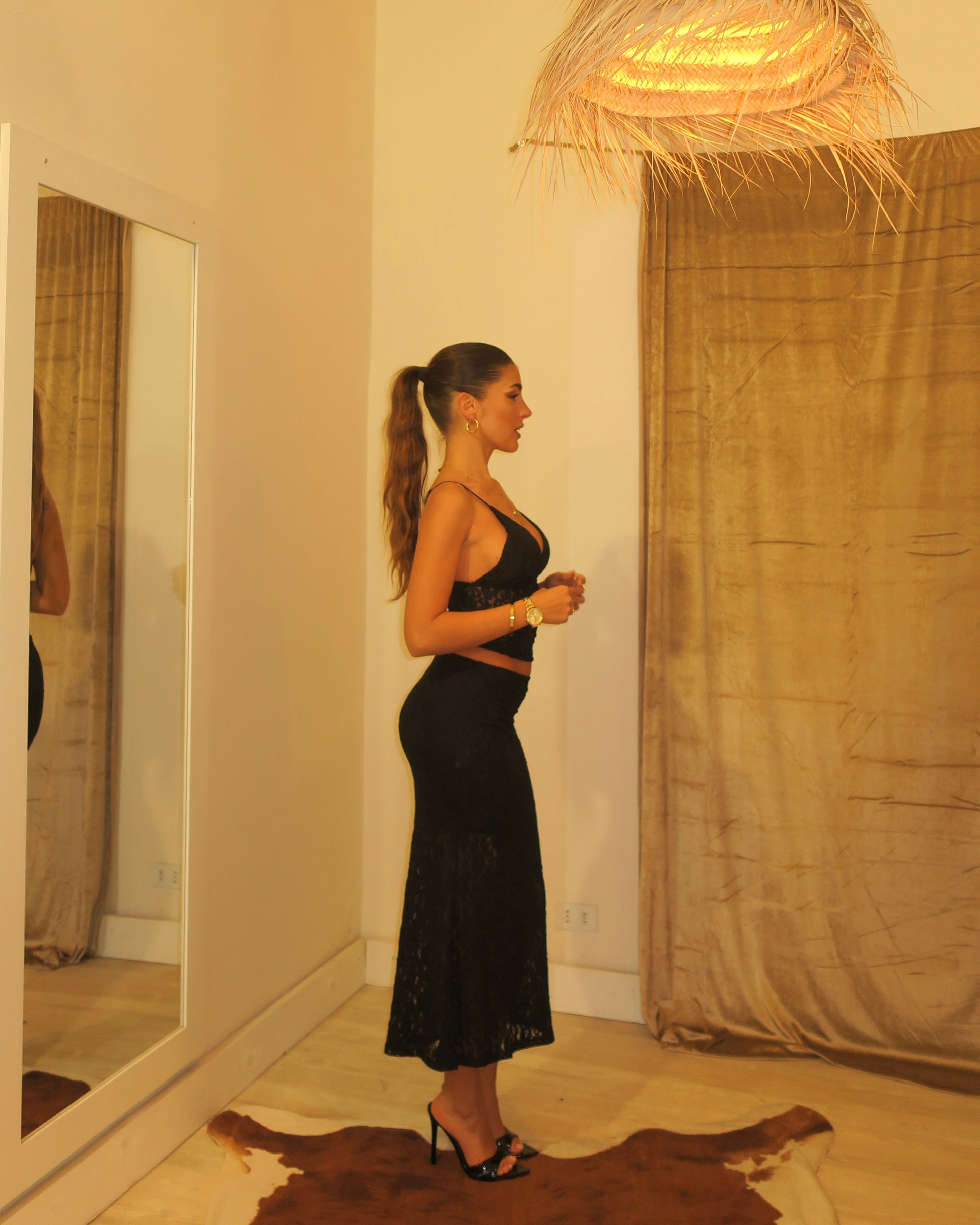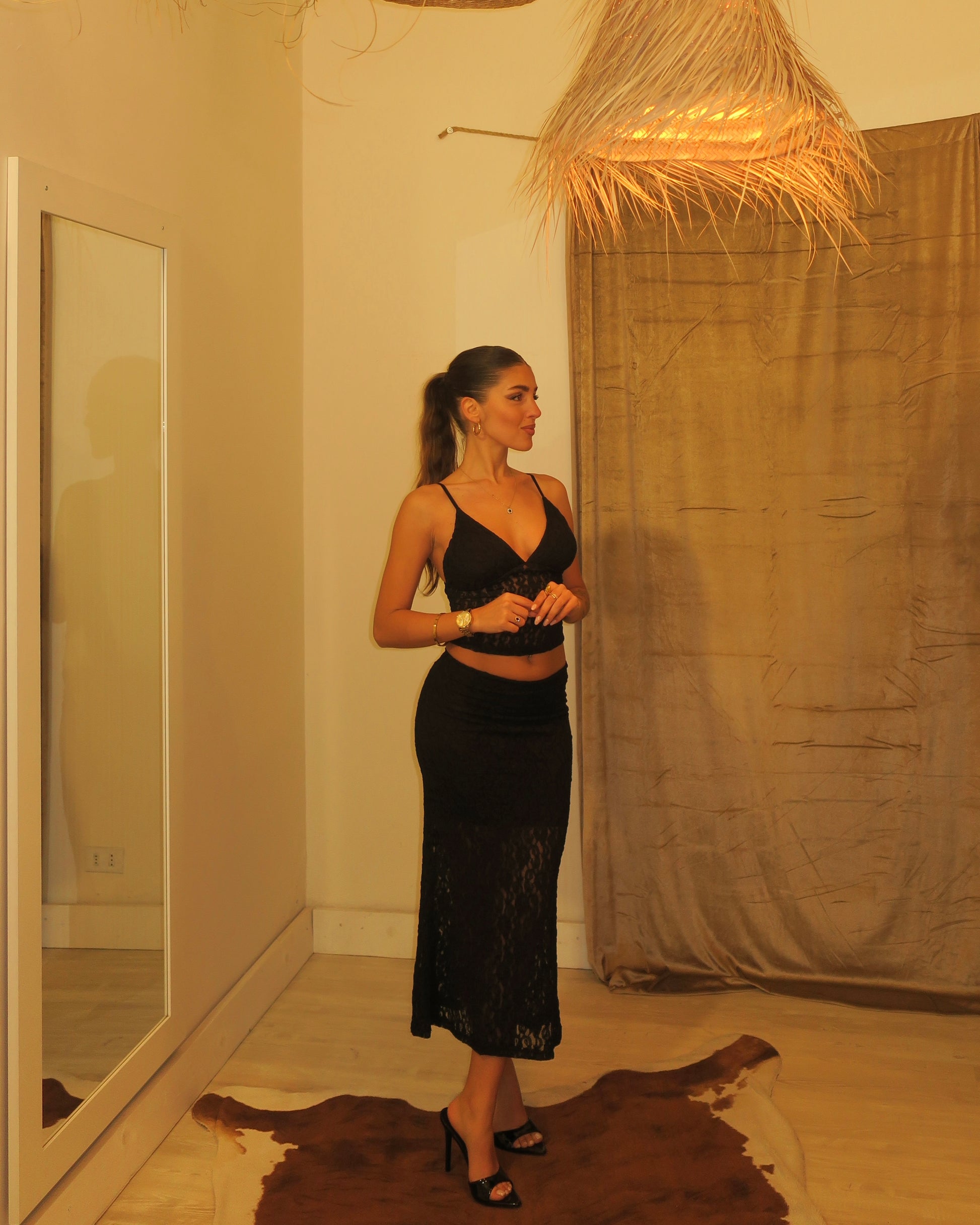 Un completo che profuma di primavera e romanticismo. Top e gonna in pizzo, leggero e raffinato, che accarezza le forme con eleganza. Il top con spalline sottili e regolabili e scollo a V valorizza il décolleté, mentre la gonna midi aderente slancia la silhouette con un tocco sensuale ma sofisticato.