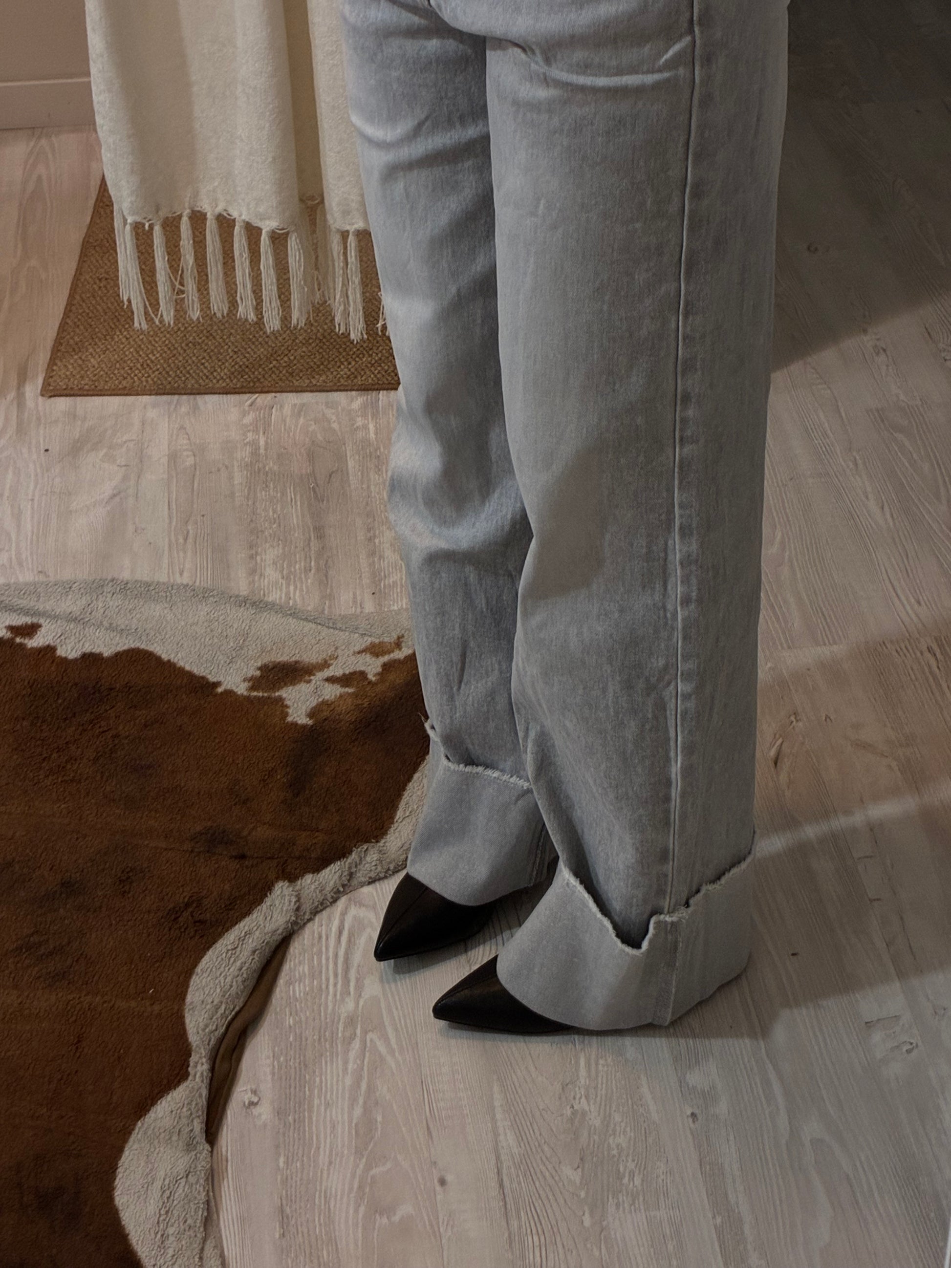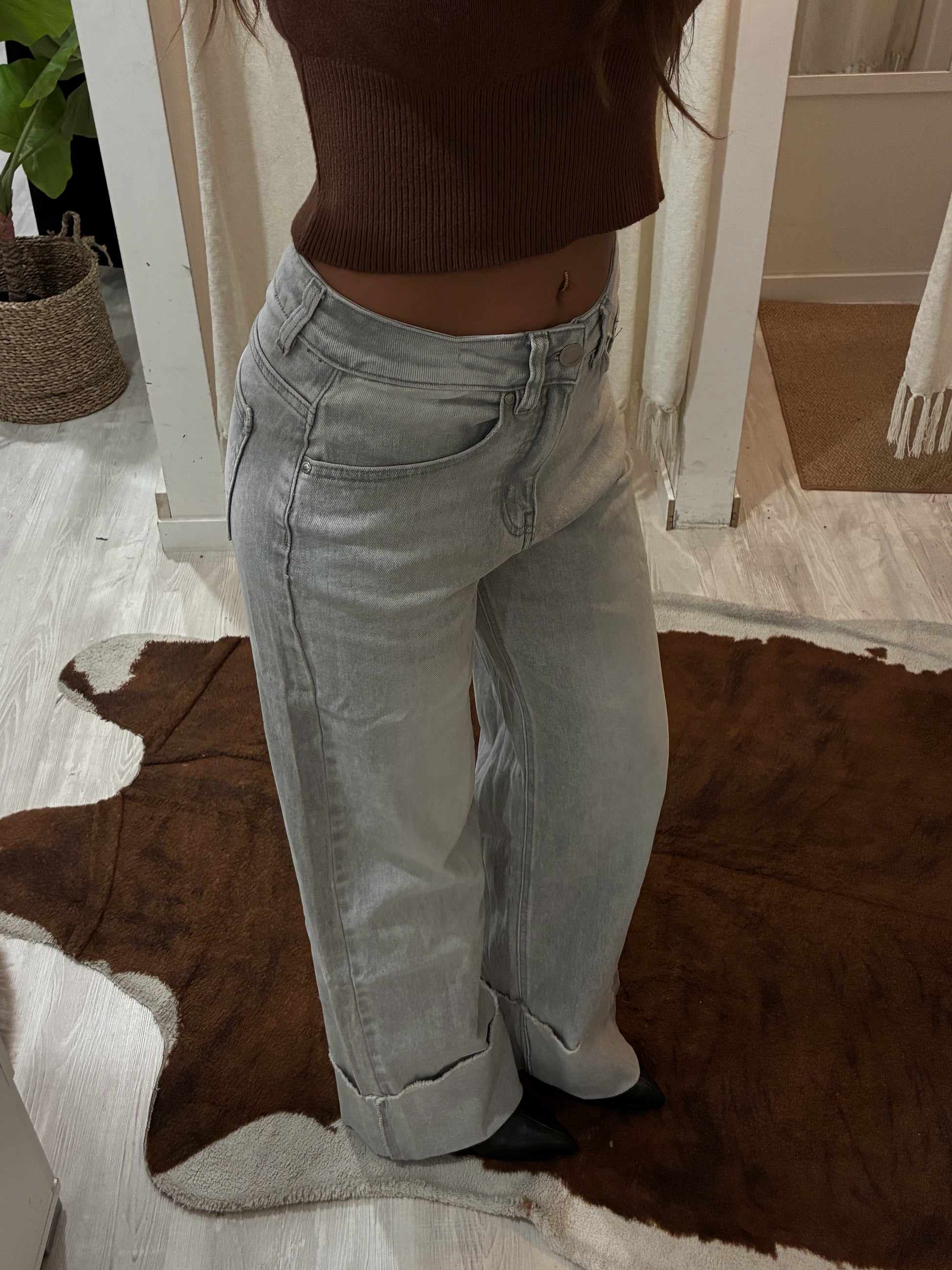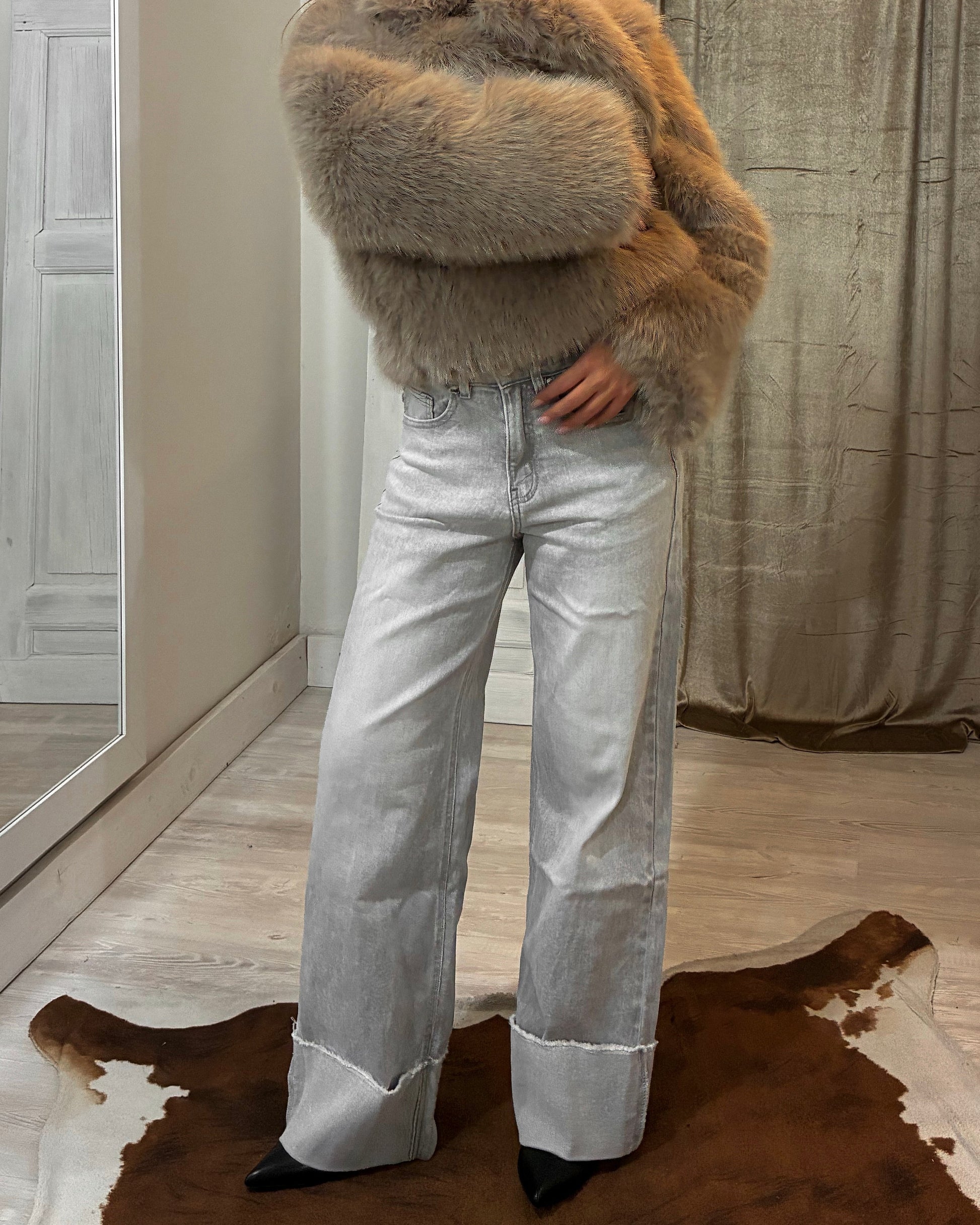 Jeans al 94% in cotone grigio chiarissimo, elasticizzato dal taglio wide leg, caratterizzati da una linea ampia e fluida che slancia la figura. La gamba è morbida con risvolto sfrangiato.