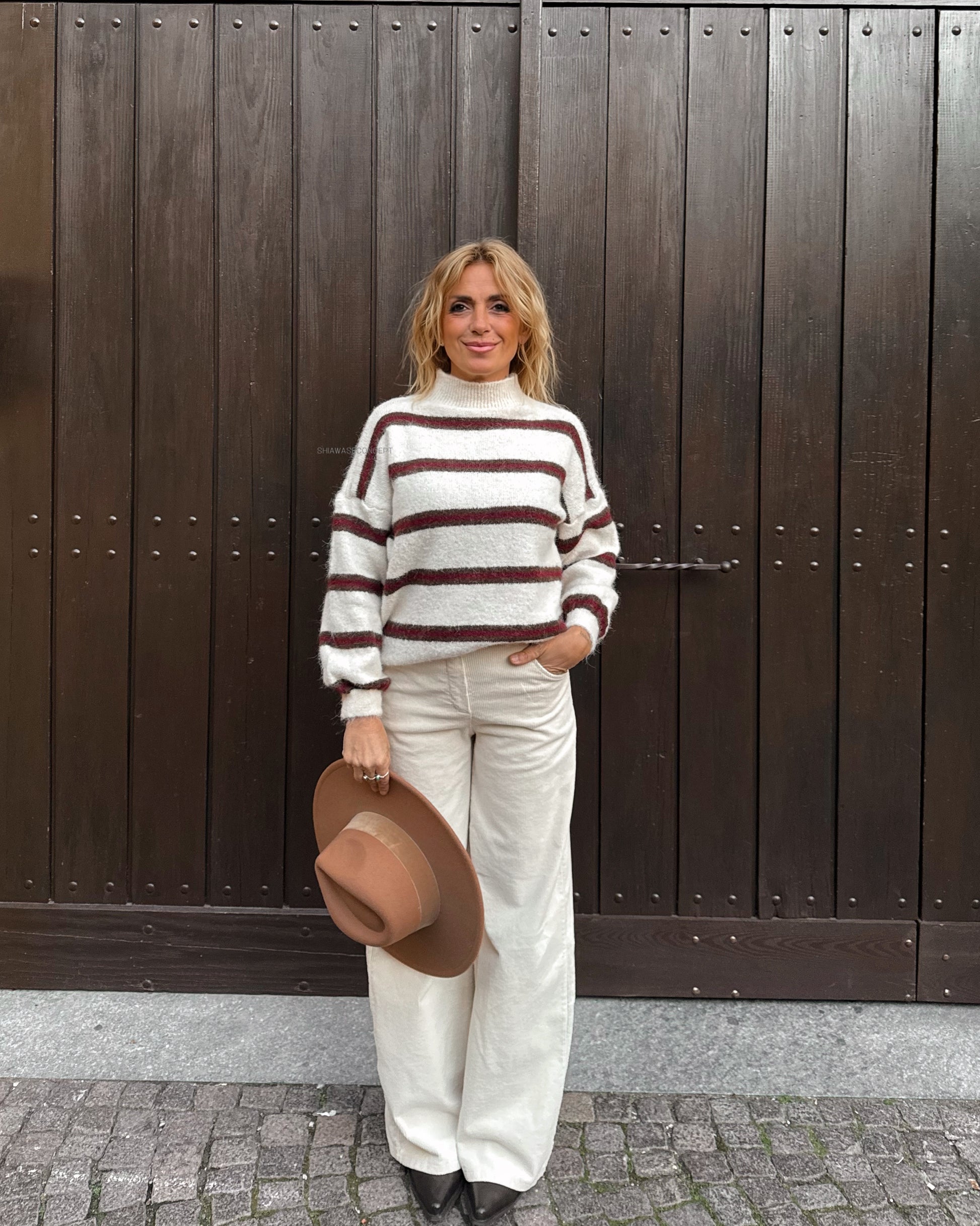 Questa maglia in filato a righe è ideale per il tempo freddo. Manica a spalla bassa. Soffice, calda e confortevole.
