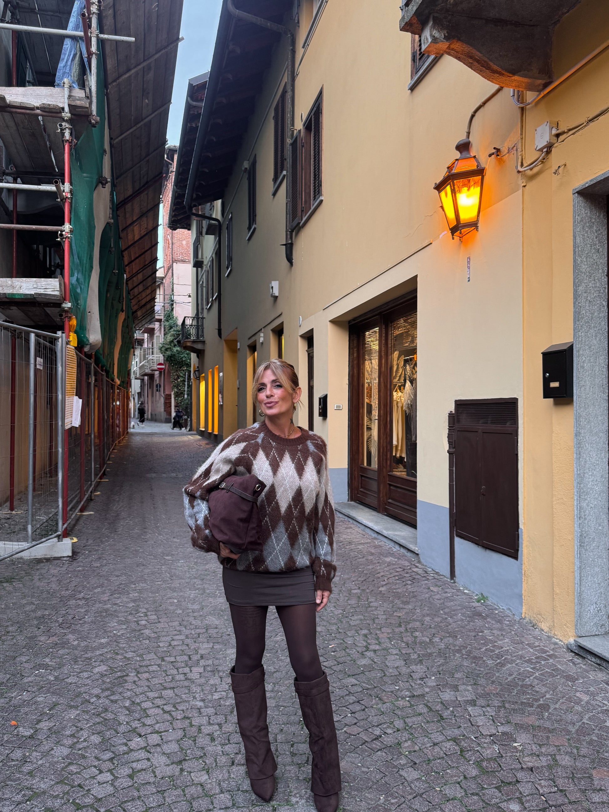 Maglia a rombi, girocollo, colore moro/beige/grigio. Morbida e rilassata, ideale per un comfort avvolgente con un tocco casual chic.