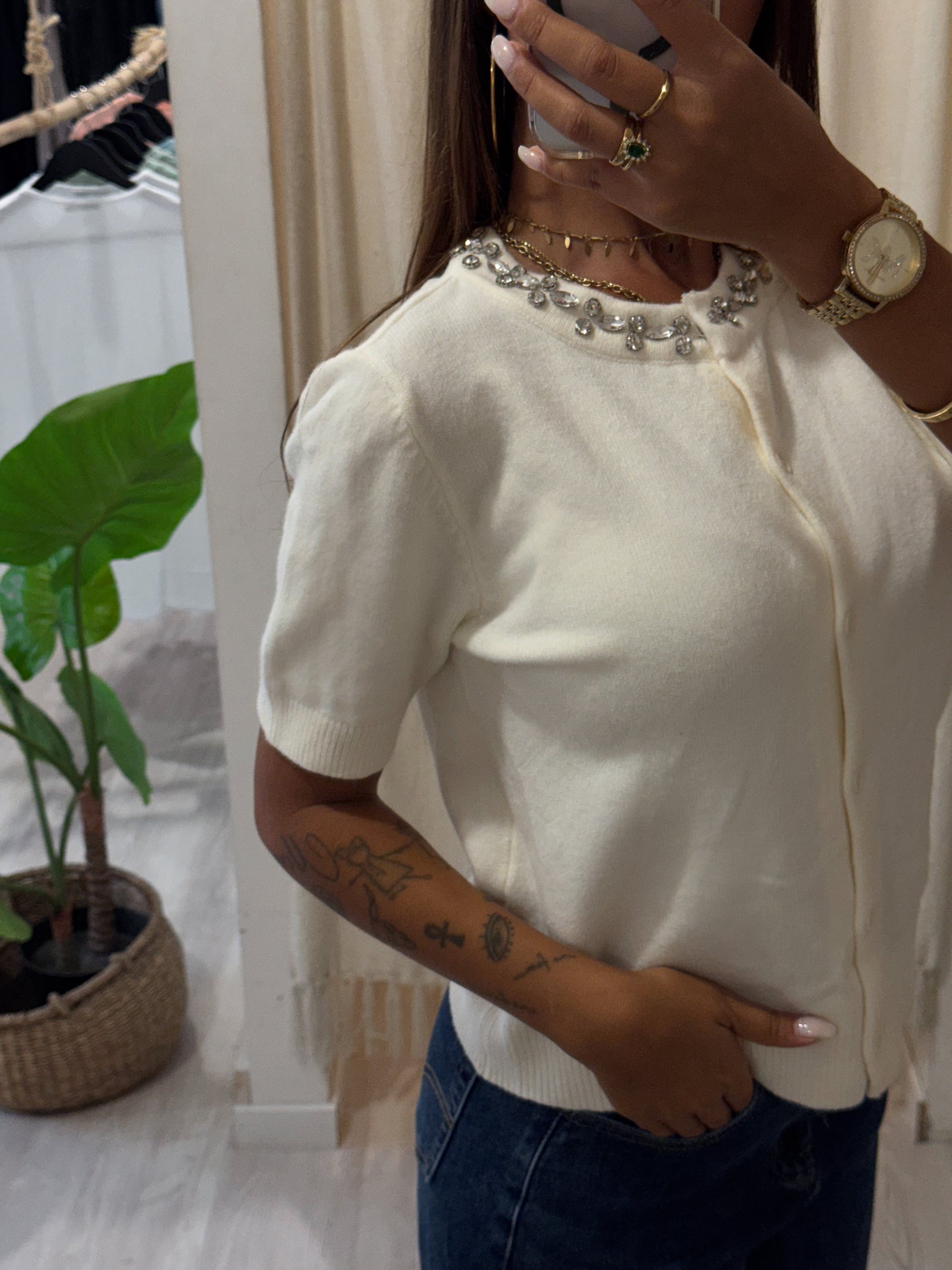 Semplicemente elegante, la maglia Tiarè è realizzata in morbida viscosa e presenta un colletto impreziosito da diamantini. Le maniche corte la rendono perfetta per ogni stagione e occasione, aggiungendo un tocco di raffinatezza ad ogni outfit.